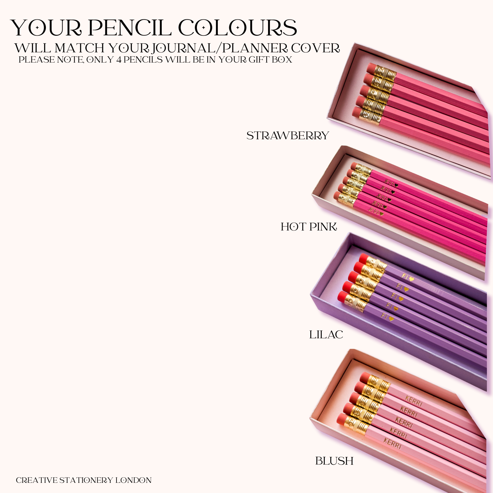 • Four personalised gold-foiled pencils